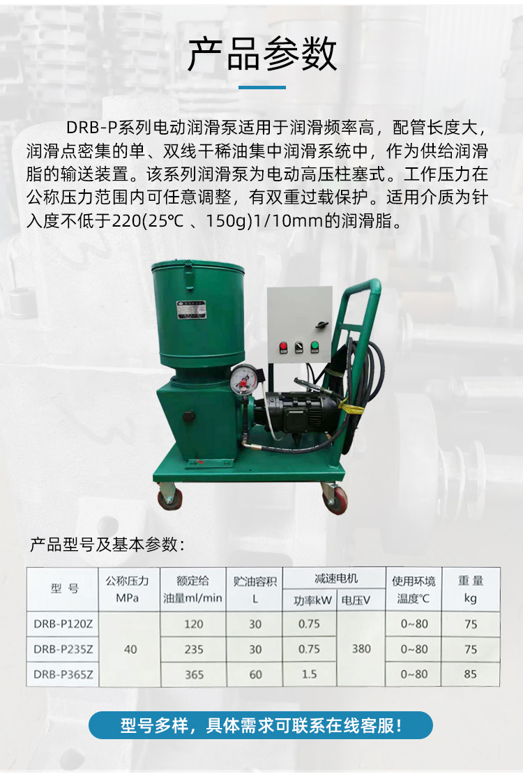 用(yong)途: DRB-P 型流(liú)動車式(shi)潤滑泵(beng)适用于(yú)潤滑頻(pín)率高、配(pèi)管長、潤(rùn)🧡滑點分(fèn)散😘不便(bian)于集中(zhōng)潤滑的(de)的大型(xíng)設備。該(gai)系列潤(run)滑泵為(wei)🎯電動高(gāo)壓🔞柱塞(sāi)泵。