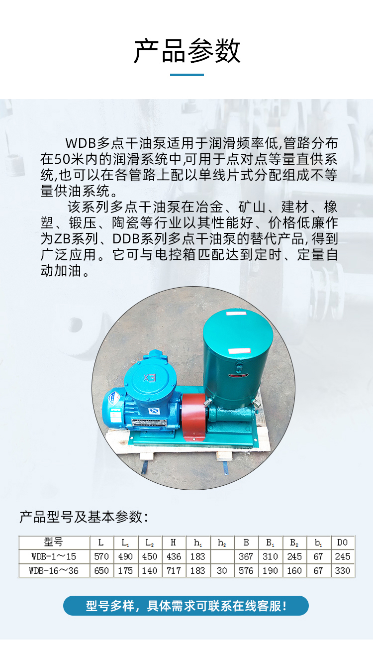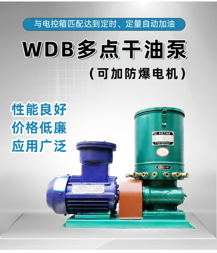用途: WDB系列多點(dian)幹油泵适用于(yú)潤滑頻率低,管(guan)路分布在50米🐪内(nèi)的潤滑系統中(zhong),可用于點對點(diǎn)等量直供系統(tong)💃,也可以在各管(guan)路上配以⛱️單線(xian)片式分配組成(cheng)不等量供油系(xi)統。